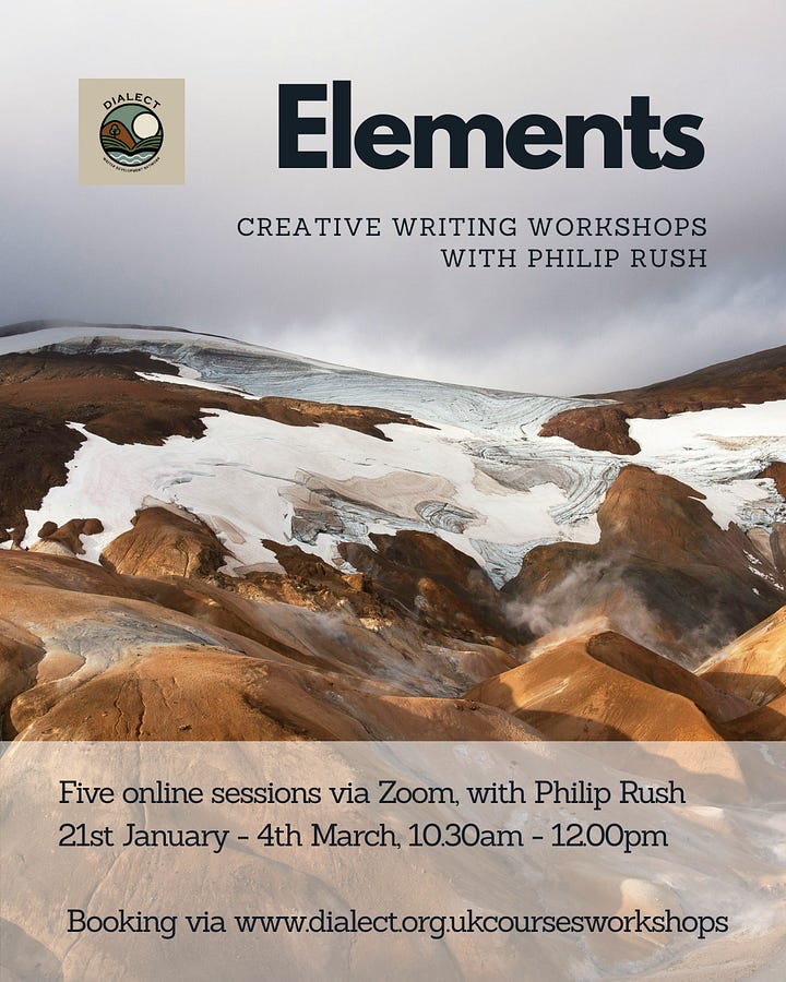 Elements with Philip Rush (Jan 21 – Mar 4): an online exploration of earth, air, fire, and water in prose and poetry.