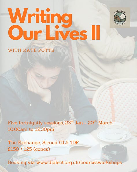 Writing Our Lives II with Kate Potts (Jan 23 – Mar 20): develop your life writing in five fortnightly sessions in person.